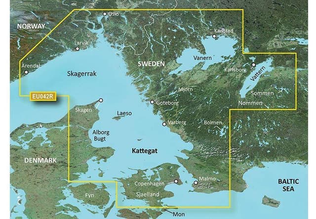 Premium sjøkart Bransjeledende dekning, klarhet og detaljer med oppdaterte sjøkart som har integrert Garmin- og Navionics®-innhold Auto Guidance1-teknologien beregner raskt en foreslått rute ved hjelp av ønsket dybde og høydeklaring Inkluderer skyggelegging av opptil 10 dybdeområder som gir deg muligheten til å få en rask oversikt over ønsket dybde Konturer på opptil 30 cm (1 fot) gir en mer nøyaktig beskrivelse av bunnstrukturen for forbedrede fiskekart Med funksjonen for skyggelegging av grunt vann kan du skyggelegge på en brukerdefinert dybde for å få et klarere bilde av grunne farvann du bør unngå Få enestående dekning og detaljer når du er på sjøen. BlueChart g3 Vision-kartene har bransjeledende dekning, klarhet og detaljer med integrert Garmin- og Navionics-innhold. Auto Guidance Få en rute som viser deg veien og hindringer i nærheten på en sikker dybde1 – enten du er på fisketur eller båttur. Skyggelegging av dybdeområde Denne funksjonen viser skyggelegging av dybdeområder i høy oppløsning for opptil 10 dybdeområder, slik at du kan vise din ønskede dybde. Skyggelegging av grunt vann Med funksjonen for skyggelegging av grunt vann kan du skyggelegge på brukerdefinert dybde for å få et klarere bilde av grunt vann du bør unngå. Detaljerte konturer BlueChart g3 Vision-kartene har konturer på 30 cm (1 fot) som gir en mer nøyaktig beskrivelse av bunnstrukturen for forbedrede fiskekart og detaljer i våtmarker, kanaler og havner. Satellittbilder Satellittbilder med navigasjonskartoverlay gir deg et realistisk bilde av omgivelsene. Dette er den mest realistiske kartvisningen vår på en kartplotter. Den er ideell når du navigerer i ukjente havneområder. FishEye-visning Dette undervannsperspektivet viser et 3D-bilde av bunnen og konturer under vannlinjen. Grensesnitt med ekkoloddata for en tilpasset visning. MarinerEye-visning Denne visningen viser et 3D-bilde av omgivelsene over og under vannlinjen. Flyfoto Krystallklare flyfoto viser deg et detaljert bilde av en rekke havner og småbåthavner. Det er ideelt når du navigerer i ukjente havneområder. 1 Auto Guidance skal bare brukes til planlegging og erstatter ikke ansvaret ditt for å navigere fartøyet på en sikker måte Dekning Detaljert dekning av norsk og svensk kystlinje fra Grimstad til Oslo, Oslo til Malmø. Kartet dekker også Danmarks kyst fra Hirtshals til København, Skagerrak, Kattegat, Øresund, Læsø, Fryken, Vänern, Vättern, Mjörn, Sommen, Nommen og Bolmen i Sverige.