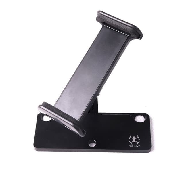 Holder laget i aluminum for å feste iPad til fjernkontroll på DJI Spark eller Mavic. Selve plasten med stangen er laget i aluminume, den fjærbelastede braketten er laget i plast.
