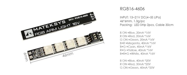 Mateksys rgb arm light 16v 2pcsfargeendring gjennom 3st dip brytere