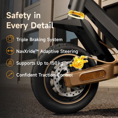 Navee ST5 Pro SE bruker et trippelt bremsesystem for maksimal sikkerhet. Det kombinerer en trommelbrems foran, en skivebrems bak og et elektronisk E-ABS-system for å sikre korte, stabile bremselengder og forhindre hjullåsing, selv på glatte underlag.