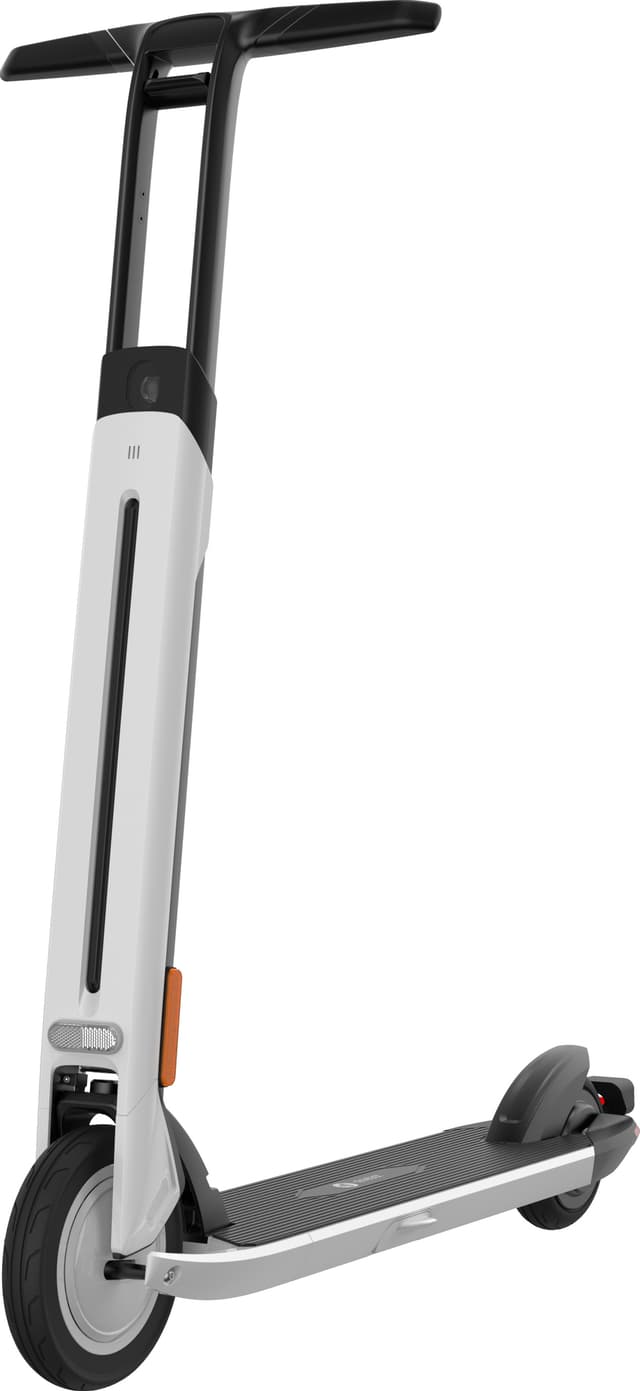 Sparkesykkelen kommer i en stilig, hvit aluminiumsfinish og kompakte 7,5-tommers dekk som gir en behagelig tur på selv ujevne underlag.