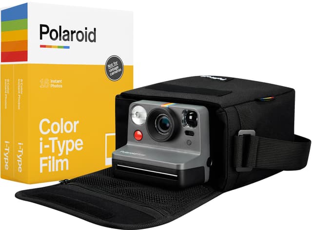 Denne samlepakken inkluderer et Polaroid Now analogt kamera i sort farge, to pakker (16 bilder) med i-Type fargefilm og en praktisk veske for kameraet.