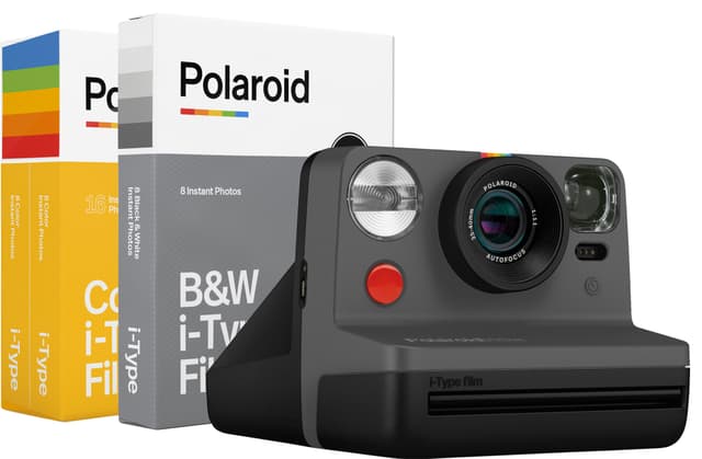 Denne samlepakken inkluderer et Polaroid Now analogt kamera i sort farge, to pakker (16 bilder) med i-Type fargefilm og en pakke (8 bilder) med i-Type sort/hvit-film.