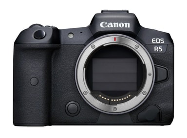 Canon EOS R5 kamerahus med Canon Control ring RF-EF. R5 er et enestående fremskritt innen speilløsteknologi og har tidenes høyeste oppløsning for et speilløst EOS-kamera. DIGIC X-prosessor, CMOS-sensor og RF-objektiver sørger sammen for forbedret bildekvalitet med oppløsning på over 45 megapiksler. Opptil 100 prosent AF-dekning med 5940 valgbare AF-punkter og ISO-område på 100–51 200 sørger for at motivet blir knivskarpt, også i svært dårlige lysforhold. Det værbestandige kamerahuset i magnesium har to kortspor for høyhastighets CFexpress- og SD UHS II-kort.