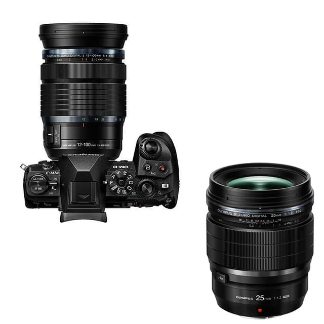 OM-D E-M1 Mark II med EZ M 12-100mm f/4 PRO og Olympus 25mm f/1.2 PRO. OM-D E-M1 Mark II er et raskt, kompakt og profesjonelt speilløst kamera fra Olympus, som tåler å være med på alle eventyr og alle steder, selv de støvete, våte og kalde.