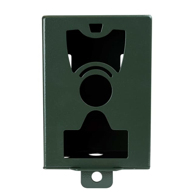 En metallbeskyttelsesetui for Trekker Premium jaktkameraer som beskytter ditt verdifulle kamera mot hærverk og tøffe værforhold. Allsidige festealternativer og en gjennomføring for en hengelås for å sikre at kameraet ditt ikke blir stjålet. Den stilige mørkegrønne fargen og designen som matcher linjene på kameraet, gjør kameraet ditt lite synlig. Gjennomføringer nederst for en ekstern strømforsyning og tripodmontering.