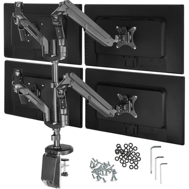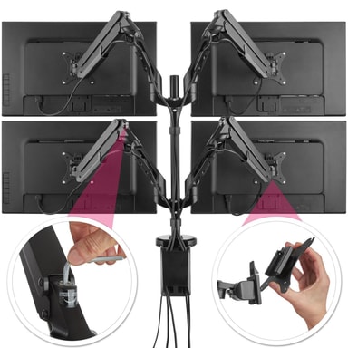 Elsker du multitasking og ønsker å ha oversikt? Da er dette bordstativer for 4 skjermer fra tectake perfekt. Dette stabile stativet er oppgradert og har fire høydejusterbare armer i pulverlakkert stål som gjør det mulig å bruke det til flere skjermer samtidig. De bøyelige, - vipp og dreibare festene gjør at du unngår reflekser og oppnår en synsvinkel med optimal ergonomi. Dette bidrar til best mulig komfort og produktivitet. Bordstativet for monitorer er plassbesparende og enkelt å montere og har et praktisk kabelføringssystem som sørger for orden og oversikt.