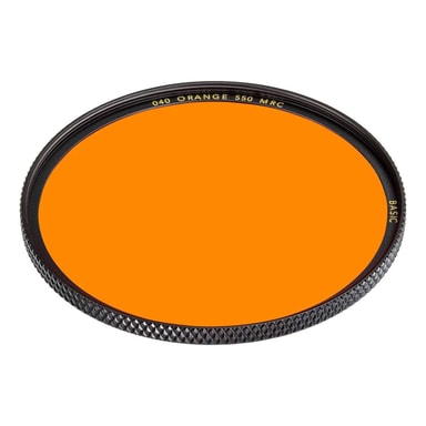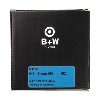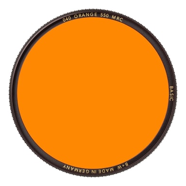 Dette #550/040 oransje MRC Basic-filteret fra B W kan brukes til å øke bildekontrasten ved å bruke svart-hvitt-film. Når du bruker dette filteret, gjengis grønne, blå og fiolettfargede motiver i mørkere gråtoner enn hvis et filter ikke ble brukt. Samtidig gjengis gule, oransje og røde motiver i lysere gråtoner.
