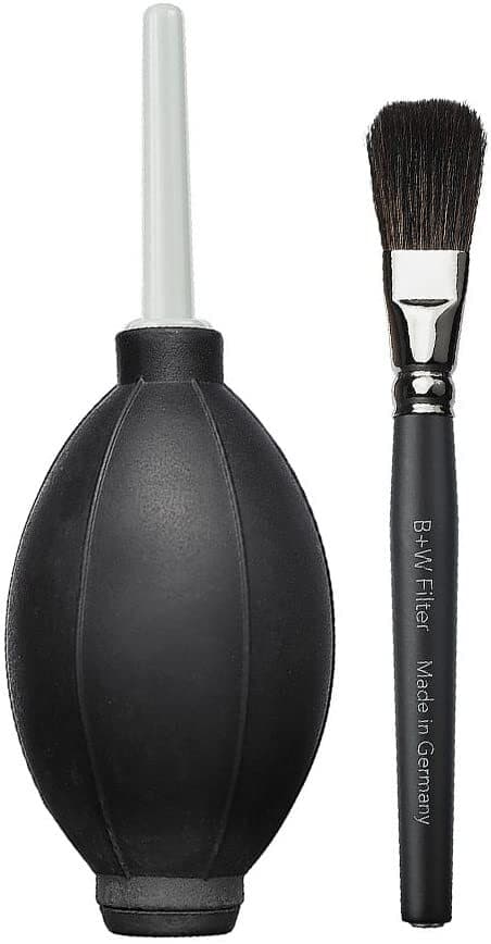 B W Rengjøringssett i 2 deler består av en blåsebelg og rengjøringspensel. For å oppnå gode bilder er det helt essenielt at optikken er ren. Støv og fingeravtrykk svekker den optiske ytelsen til objektiv eller optiske filtre av høy kvalitet, og må derfor vaskes regelmessig.