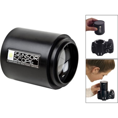 Delkin Devices Sensor Scope gir et trygt og effektivt system for å undersøke digitale speilreflekssensorer. Den har 5x forstørrelse og fire LED-er for enkel spotting av forurensninger. Den kjører på to medfølgende CR2025-batterier og inkluderer en oppbevaringsveske med to rom.