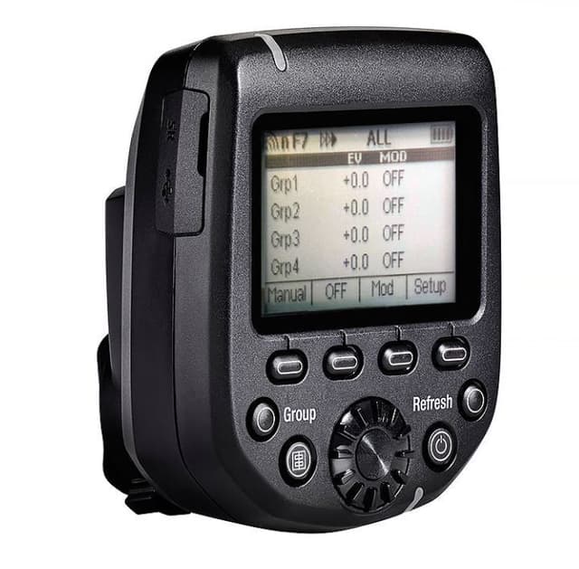 Transmitter Pro kommunicerar tvåvägs vilket gör att blixtarnas inställda uteffekt visas på fjärrkontrollens tydliga LCD Display.