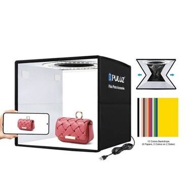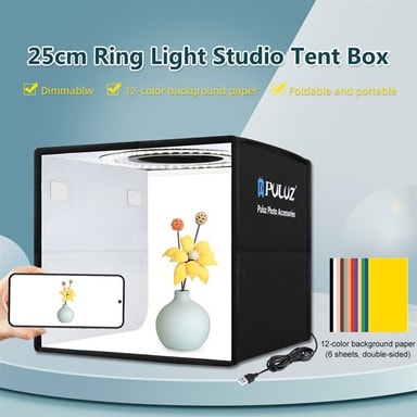 Et kompakt og brukervennlig fotostudio på 25 cm, designet for fotografering av små produkter. Perfekt for fotografering av smykker, tilbehør, leker, klokker og andre små gjenstander. Den innebygde LED-ringen gir et jevnt lys uten skygger og refleksjoner, noe som sikrer profesjonelle bilder hver gang. Den bærbare og sammenleggbare designen gjør studioet enkelt å ta med seg og sette opp på en hvilken som helst overflate, slik at du alltid kan ha en ideell bakgrunn for produktbildene dine.