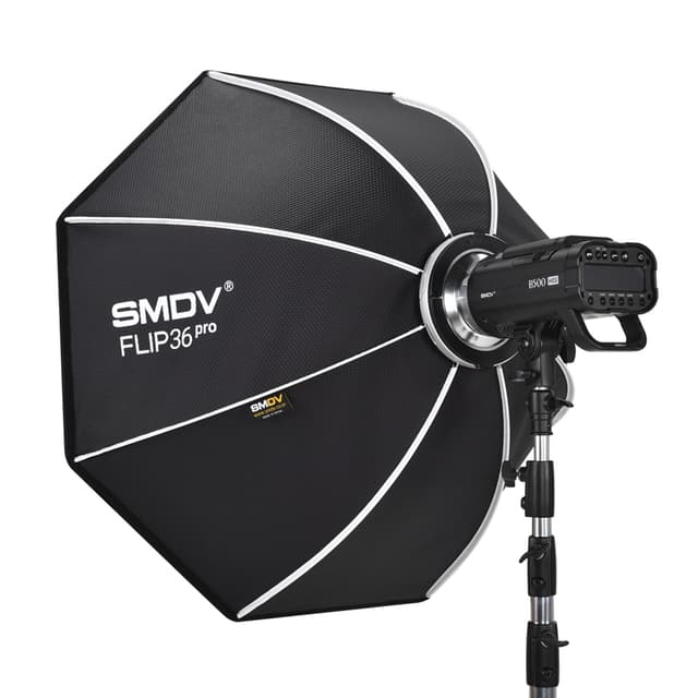 Med SMDV Speedbox Flip36 Pro skaper du vakkert, jevnt lys i studioet ditt eller på Location. Midt- og front diffusorene  på Pro softboksene avtagbare og de er tynnere noe som er utmerket for bruk av LED-belysning. Pro-en bruker preget stoff for å myke opp lyset. Stoffet er ikke-fluorescerende, ingen misfarging, flammehemmende, vanntett og har UV-belegg.
