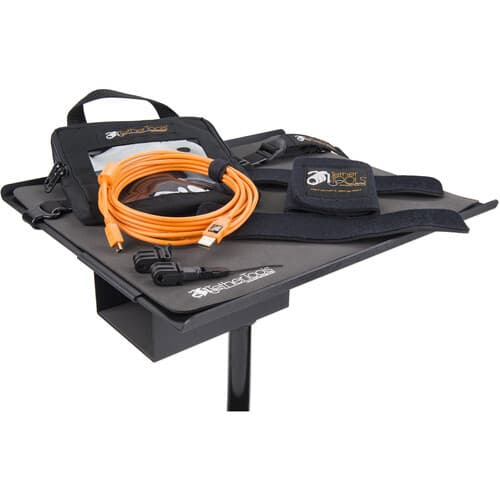 Komplett tetheringbord med USB Mini B 5-pinners kabel. Et sett spesialdesignet for profesjonelle fotografer som ønsker orden og er klare til å være fokusert på fotografering i stedet for på utstyr. Pro Tethering Kit inkluderer datamaskin- / tilbehørstabeller, ekstern harddiskholder, polstret datamaskinunderlag, datasikkerhetsstropp, stropp More-holder for mindre tilbehør, TetherPro USB 2.0 USB-minikabel, dust-stopper for kamera og datamaskin, og etui.
