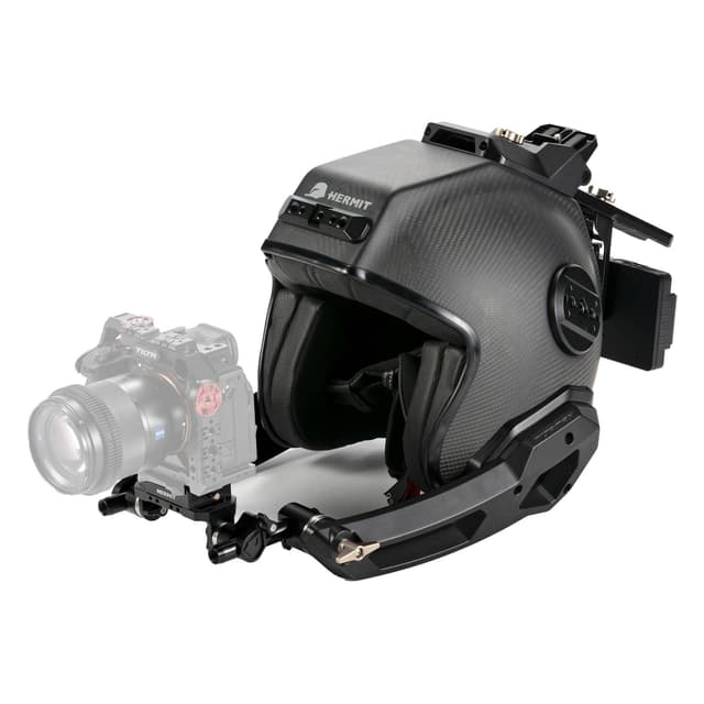 Kjernen i systemet er den lette, ripebestandige karbonfiberhjelmen. Hjelmen stø tter ulike alternativer for rigging av kameraer, ekstern strø m og annet tilbehø r som trå dlø se videosendere. Hermit bruker to rosett-monteringsarmer med ledd som kan stø tte kompakte kameraer bå de foran og bak hjelmen. To forskjellige monteringsplater og sekundæ re rosettforlengerarmer gir mulighet for ytterligere leddpunkter om nø dvendig for å oppnå mer komplisert kameraplassering eller bedre balansering av mindre vanlige oppsett. Den justerbare batteriplaten på baksiden av hjelmen lar deg drive kameraet og tilbehø ret via Gold Mount eller V-Mount batterier. Batteriplaten kobles til en balansemodul som kan justeres lenger eller næ rmere hjelmen for perfekt å motvirke vekten av kameraet nå r det er montert foran. Ekstra motvekter er inkludert for å sikre perfekt balanse og komfortabel betjening.