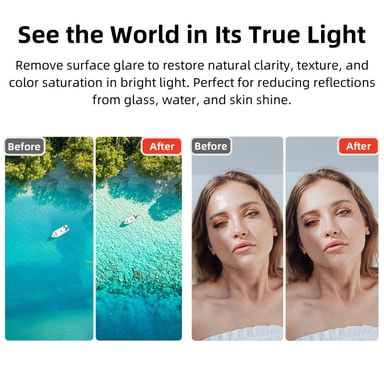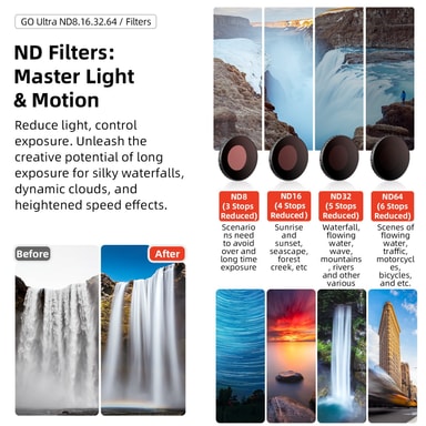 Forbedret bildekvalitet: Fang fantastiske bilder av høy kvalitet med Insta360 GO Ultra Vanntett Filtersett. Disse filtrene er designet for å redusere gjenskinn og refleksjoner, forbedre farger og forbedre kontrasten under forskjellige lysforhold. ND-filtrene (Neutral Density) (ND8, ND16, ND32) kontrollerer mengden lys som kommer inn i objektivet, og forhindrer overeksponering i sterkt sollys, noe som gir bredere blenderåpninger og langsommere lukkerhastigheter for å oppnå filmisk bevegelsesuskarphet. CPL-filteret (Circular Polarizing) reduserer refleksjoner fra ikke-metalliske overflater som vann og glass, noe som resulterer i rikere, mer levende farger og økt klarhet. Perfekt for utendørseventyr, vannsport og hverdagsfotografering, sikrer dette filtersettet at din Insta360 GO Ultra fanger profesjonelle videoer og bilder.