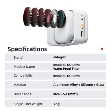 Forbedre Insta360 GO Ultra-opptakene dine med dette vanntette filtersettet. Inkluderer ND8, ND16, ND32 og CPL-filtre for optimal bildekvalitet under alle forhold. Beskytt linsen din og ta fantastiske bilder.Les mer om produktet