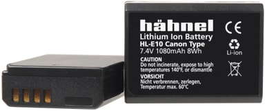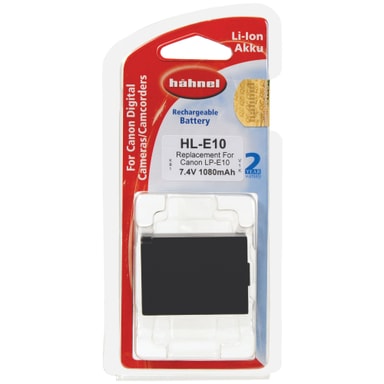 Hähnel HL-E10 Li-ion kamerabatteri tilsvarer Canon LP-E10-batteriet for digitalkamera og videokamera fra Canon. Batteriet har en kapasitet på 1080 mAh og en spenning på 7,4 V.