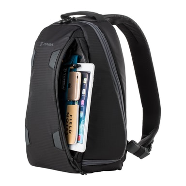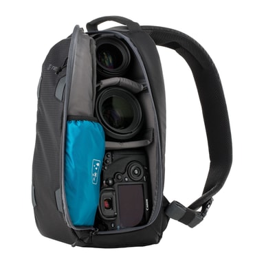 Tenba Solstice Sling Bags kombinerer bærekomforten hele dagen og støtten til en ryggsekk med rask tilgang til kameraet som en skulderveske. Den 7-liters Sling bagen passer til et speilløst kamera eller DSLR-kamera med 2-3 linser (opptil 70-200 mm 2,8), pluss en iPad Mini eller lignende 8-tommers nettbrett. Den passer også til DJI Mavic og andre kompakte droner. Sidelommen passer til en stor vannflaske eller et kompakt stativ, og vesken inkluderer et avtakbart WeatherWrap-regntrekk for ekstra beskyttelse på våte værdager. De flyttbare deleveggene kan lett konfigureres etter eget behov.