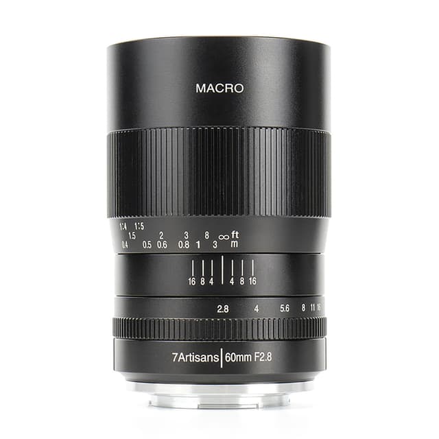 7Artisans 60mm f/2.8 Macro er et kort teleobjektiv, godt egnet for nærfotografering. Med 1:1 maksimal forstørrelse og et flytende elementdesign oppnår den høy skarphet og klarhet i hele fokusområdet. Objektivets manuelle fokus, sammen med en avklikket blenderring for jevn lydløs rotasjon, gjør at den passer meget godt til videoapplikasjoner. I tillegg bidrar en 10-blads membran til en behagelig bokeh-kvalitet.