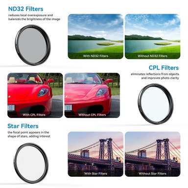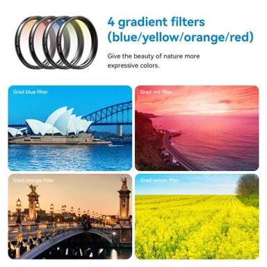 Dette allsidige settet inneholder polariserende, nøytral tetthet, stjerne- og fargegraderte filtre som gir deg full kontroll over lys, kontrast og farger i bildene dine. Perfekt for smarttelefonfotografering samt bruk med kameraer.