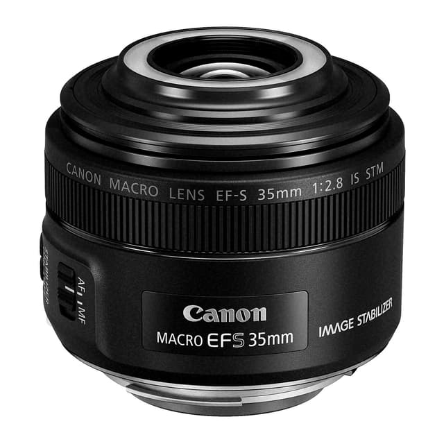 Canon EF-S 35mm f/2.8 Macro IS STM. EF-S 35/2,8 er et kompakt makroobjektiv til Canons systemkameraer med APS-C sensor. Objektivet har innebygd LED-belysning og egner seg utmerket for produktfotografering av små objektiver, nærbilder av blomster og også som et fast normalobjektiv.