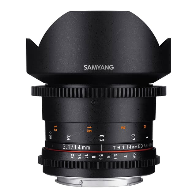 Samyang 14mm T3.1 ED AS IF UMC super vidvinkelobjektiv til fullformat og APS-C sensor kameraer. VDSLR versjonen av 14mm objektiv er designet spesifikt til Video/Cine formål. Blenderingen er konstruert uten ""klikk"" slik at den gir trinnløs og lydløs innstilling av blenden. Objektivet har også en fokusring designet til brukes sammen med ""follow-focus""-enheter. Blende- og avstandsskala er på siden av objektivet slik at de er synlige når objektivet brukes til videofilming.