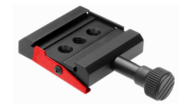 Hurtigutløserenhet fra Foba. Den tar forskjellige hurtigutløserplater og har en avtakbar og en vippbar sikkerhetsplugg.