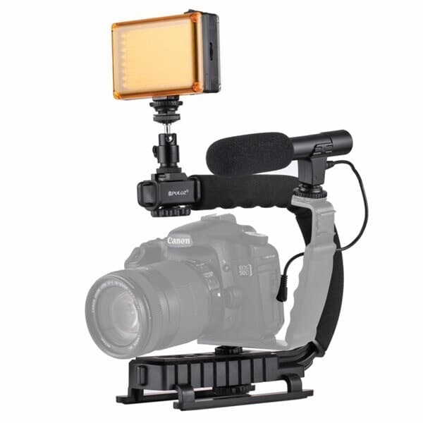 Håndstativ/stabilisator som forbedrer stabiliteten ved videoinnspilling. Det C-formede designet gjør enheten mer praktisk og passer perfekt til flervinklet filming. Topp med ”cold shoe-konstruksjon” som tillater montering av mikrofon eller videolys. Bunn med sklisikre føtter og standard ¼-skrue som kan låse fast DSLR- eller videokameret til stabilisatoren hardt. Mykt skumgrep øker komforten og gjør det lettere med lange innspillingssesjoner. Stativet er konstruert av høykvalitativt og robust ABS-materiale.