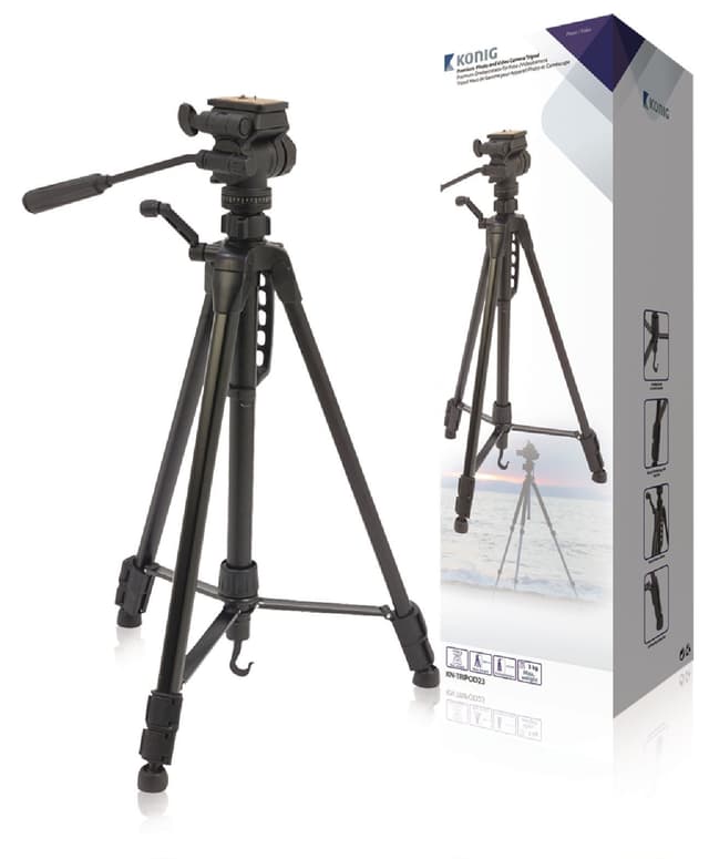 Product description: tripod for photo and video cameras to shoot stable and razor-sharp images. It has a maximum height of 158.5 cm and equipped with 2 bubble levels and self-levelling rubber feet that help to further balance a camera. A sand bag or camera bag can be attached to the hook at the lowest point of the centre column, which increases the stability of the tripod. The 3-section channel legs with flip locks and the geared braced centre column enable an adjustment of the tripod height to realise different shots. The tripod features a convenient grip handle and is supplied with a carrying bag to easily bring it along. features: 3-level extendable legs. 2 bubble levels. geared braced centre column. sand bag hook on centre column.