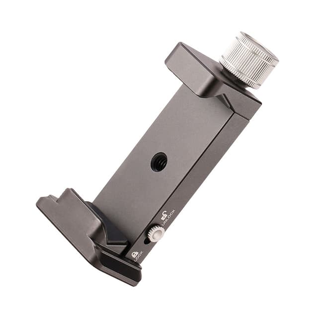 Klemme-feste for mobiltelefoner så du kan montere dem på stativ. Klemmen støtter både Arca Swiss festeplate og 1/4"" gjengefeste.