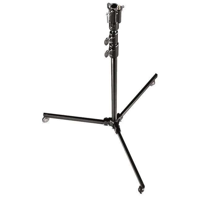 Lysstativ med stålbase og svartioniserede aluminiumsprofiler. 3 seksjoner hvorav 2 justerbare. Et utjevningsben. Komplett med hjul. Demonterbart.