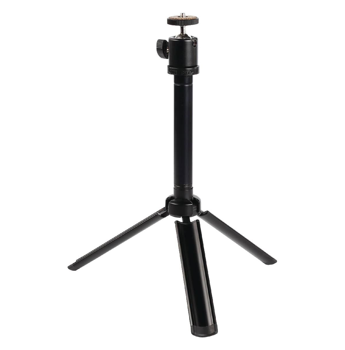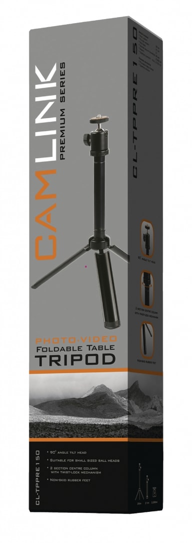 Product description: this foldable table tripod is adjustable in height with a minimum length of 210 mm and a maximum length of 390 mm. features: 2 section centre column with twist-lock mechanism. non-skid rubber feet. 90° angle tilt head. suitable for small sized ball heads.