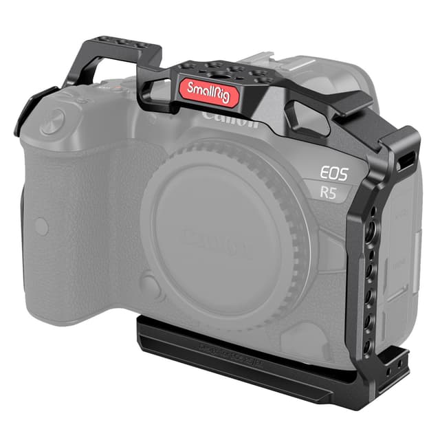 SmallRig Camera Cage for Canon EOS R5 og R6 (2982B) opprettholder tilgang til kameraets kontroller og har en rekke monteringsalternativer. I tillegg til den innebygde NATO-skinnen på toppen, en Cold Shoe og flere 1/4"" -20 og 3/8"" -16 gjengede hull, har dette utformede aluminiumsburet flere monteringer i ARRI-stile for å forhindre at tilbehør vrir seg når den er montert på buret. Buret har også to anti-twist pinner på grunnplaten i tillegg til 1/4"" -20 kameraets monteringsskrue slik at kameraet ditt ikke kan bevege seg rundt i buret.