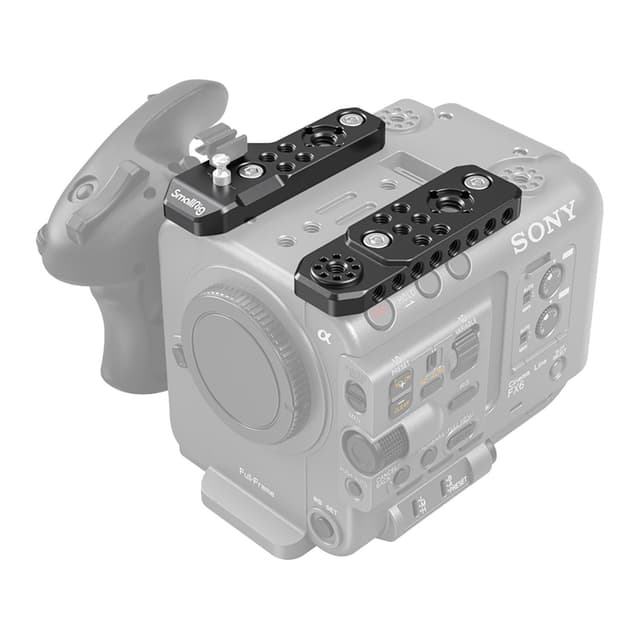 SmallRig 3186 Sony FX6 topplate festes til Sony FX6 via fire 1/4""-20 skruer. Flere 1/4""-20 gjengede hull og to ARRI 3/8""-16 lokaliseringshull støtter diverse tilbehør, som SmallRig Magic Arm 2115. Den er kompatibel med det originale håndtaket, kabelklemmen og fokusknappen. Den leveres med en standard LCD adapteråpning på toppen, tilgjengelig for montering av LCD-montering og SmallRig LCD-skjermmonteringsklemeadapter 1831. De gjengede hullene på siden passer til SmallRig Top Handle 1638, og gir tohånds løsning som muliggjør skudd over hodet.