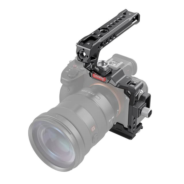 SmallRig 3237 Half Cage Kit for Sony Alpha 7S III inkluderer SmallRig Half Cage 3193, HDMI-kabelklemme 3000 og ARRI topphåndtak 2165. Håndtaket letter armens belastning i lavvinkelfotografering og har monteringspunkter for tilbehør. Buret og håndtaket kommer med flere 1/4”-20 gjengede hull, ARRI 3/8""-16 lokaliseringshull, for montering av SmallRig Side Handle 2093 og Monitor Mount 2903, og med cold shoe for montering av mikrofoner, LED-lys og skjermfesteg 2905. HDMI-kabelklemmen festes til siden av buret via en 1/4""-20 skrue og to vridbare lokaliseringspinner for å beskytte HDMI-porten. Med Arca Swiss plate på bunnen av buret passer DJI RS 2 og RSC 2 gimbal og Arca type stativ, slik at du raskt kan bytte mellom gimbal og stativ når du filmer.