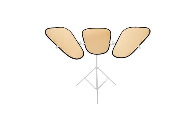 Triflector MkII-reflektoren er mye brukt i Makeup- og motefotograferinger på grunn av de karakteristiske ""Catch Light"" refleksen i øynene. De hengslete refleksskjermholderne gjør alle tre panelene individuelt justerbare for å få lys akkurat der du trenger det. Alle panelene brettes som våre sammenleggbare reflekterende paneler.