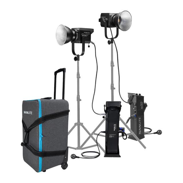 Nanlite Forza 500 LED. En LED lampe i monolight-stil med bemerkelsesverdig lysstyrke i forhold til den lille størrelsen. Med en vekt på bare 2,5 kg (ca) har Forza 500 en effekt på opptil 46613 lumen (66300 Lux 5600K @ 1 meter), CRI / TLCI på 98/95, 0-100% dimming, en fargetemperatur på 5600K, DMX-tilkobling, forhåndsprogrammerte spesialeffekter og en innbebygget Bowens stil softboksfeste.