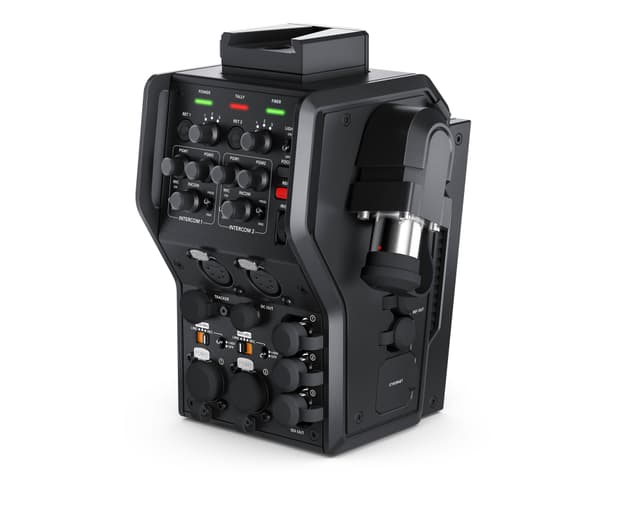Til URSA Broadcast-kamera for å kommunisere med studioinfrastruktur via SMPTE fiberoptisk kabel og en separat tilgjengelig Studio Fiber Converter for breakout opptil 4 kilometer unna. Konverteren flytter de vanligste kamerakontrollene til baksiden av kameraenheten for enkel tilgang til operatøren. Studiostandard-tilkobling inkluderer 5-pinners XLR-porter for talkback-hodesett, samt SDI-video for skjermutgang. Totalt har Camera Fiber Converter en enkelt utgående 12G-SDI-tilkobling for HD- eller UHD 4K-video og tre innkommende 3G-SDI-tilkoblinger for overvåking med en separat studiosøker. Bruk V-låsen på toppen for å sikre studiosøkeren.