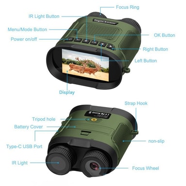 Bærbar og brukervennlig: Designet for bekvemmelighet og brukervennlighet, er denne nattkikkerten lett og bærbar, noe som gjør den ideell for utendørs eventyr. Den ergonomiske designen sikrer et komfortabelt grep, mens de intuitive kontrollene gir enkel betjening, selv under utfordrende forhold. Det innebygde 2600mAh batteriet gir opptil 8 timers kontinuerlig bruk med det laveste IR-nivået, og sikrer at du har rikelig med strøm for lengre ekspedisjoner. Det medfølgende tilbehøret, som en snor, rengjøringsklut, datakabel, kortleser og oppbevaringspose, forbedrer brukeropplevelsen ytterligere, noe som gjør denne kikkerten til et must for enhver friluftsentusiast. Kompatibel med eksterne strømkilder for utvidet bruk.