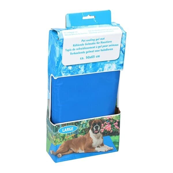 En kjølig gelematte for kjæledyr i størrelse L. Legg den i hund- eller kattekurven, på gulvet, i bilen eller ta den med på reisen for å avkjøle kjæledyret ditt under varme dager.