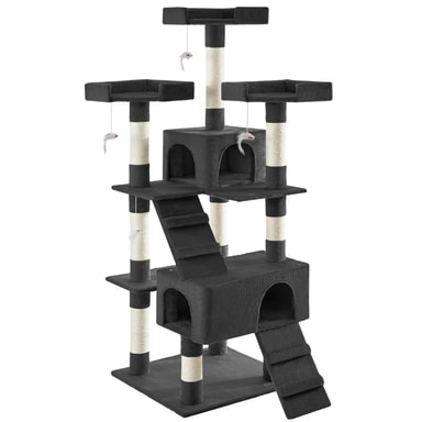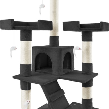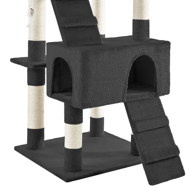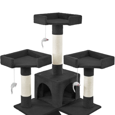 Et kattetre gir kattene dine berikelse og vil være et virkelig høydepunkt i hjemmet ditt. Et kattetre tilbyr katten eller kattungen din en rekke forskjellige skrapestolper, liggeplattformer og hus, noe som betyr at de vil ha et nytt favorittsted å sove på, klø på en stolpe og leke, og forhindre at møblene dine får ytterligere skade. Kattetrær er utrolig berikende ettersom de lar kjæledyret ditt uttrykke naturlig atferd som klatring og hopping. Katter er naturlig nok veldig nysgjerrige dyr, så det vil bli satt stor pris på å gi dem et stort utsiktspunkt hvorfra de kan overvåke riket sitt. Klorestativet har til og med hengende museleker, slik at katten din kan øve seg på jakt og støt. Dette kattetreet er det ideelle tillegget til ethvert kattelskers hjem.