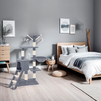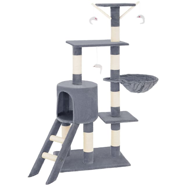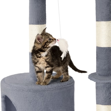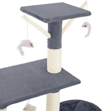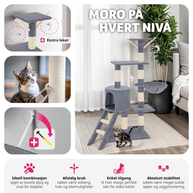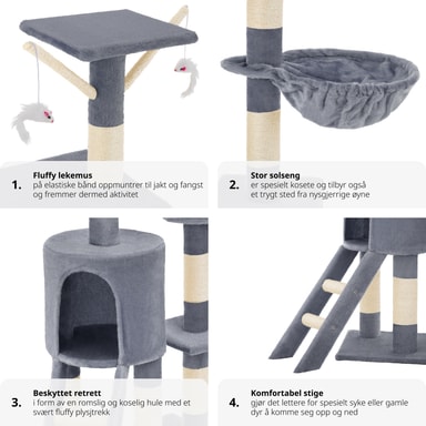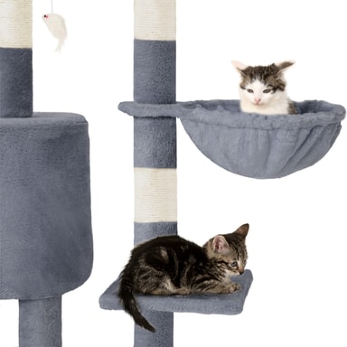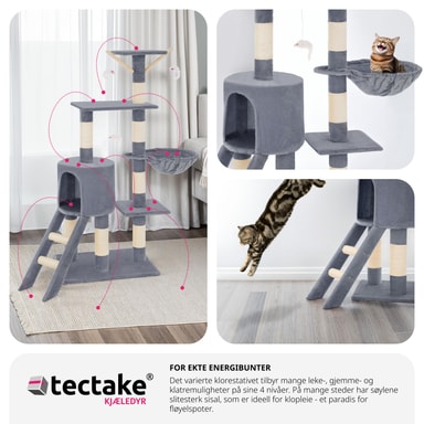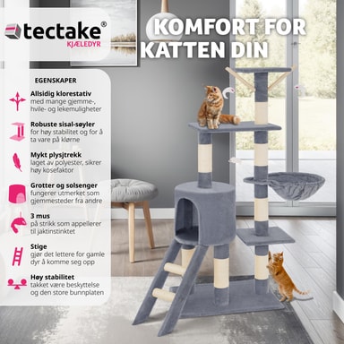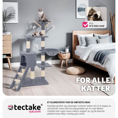Med dette fantastiske kattetreet fra tectake vil kjæledyret ditt ha timevis med berikende moro. Et kattetre er et flott høydepunkt for enhver katt. Med et kattetre kan katter slipe klørne optimalt mens møblene dine forblir uplettede, samtidig som de klatrer og holder seg aktive. Dette kattetreet inneholder også mange soveplasser, for eksempel den avslappende hengekøyen eller den lille hulen. Katter er nysgjerrige dyr og elsker å ha oversikt over alt - så den høye utsiktssplattformen er perfekt for å tilfredsstille dette for kattungen din. 3 hengende museleker på elastiske grener lar katten eller kattungen din leke, kaste seg og angripe. Kløestolpene er montert på mange forskjellige nivåer, slik at katten kan finne en skrapestolpe som passer deres individuelle behov. Dette betyr også at det er plass for alle dine spinnende kjæledyr å leke uten for mye krangling. Få dette kattetreet med tectake i dag og gi kattene dine et aktivitetssenter som lar dem uttrykke sine naturlige instinkter.