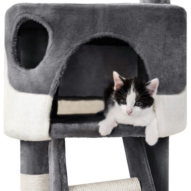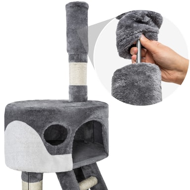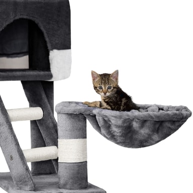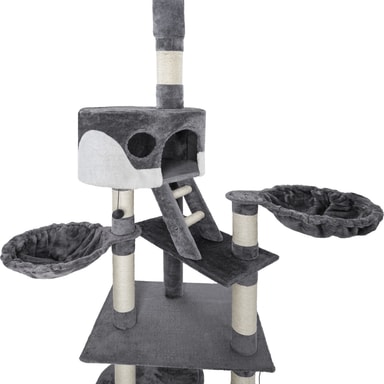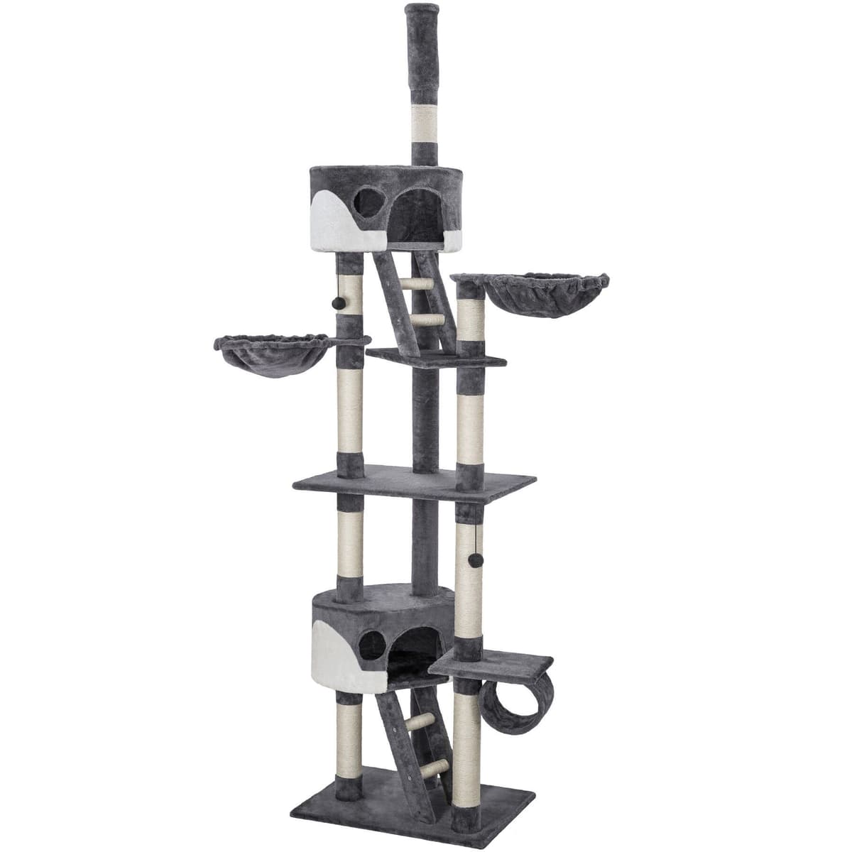 Et klorestativ er et stort høydepunkt for hver katt og er en ideell måte for katter å slipe klørne mens de holder møblene dine intakte. Men klorestativet fungerer også utmerket som et sted å sove eller kose seg. Katter er veldig nysgjerrige dyr og elsker å holde øye med alt - så et klorestativ passer akkurat for din firbeinte venn. Kattetreet består av mange forskjellige funksjoner i varierende høyder som når helt til taket. Støttesøylene er pakket inn i sisal-tau, ideelt for å tilfredsstille enhver kattunge eller katt som skraper. Kattetreet har også hengende tauleker, eventyrtunneler og avslappende hengekøyer, som hjelper katten din til å ha det gøy og kose seg. Dette store klorestativet er avrundet med 2 koselige huler, ett på lavt nivå og ett høyt, som lar kjæledyret ditt ta en viktig kattelur etter en dag med lek på kattetreet.
