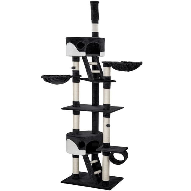Et klorestativ er et stort høydepunkt for hver katt og er en ideell måte for katter å slipe klørne mens de holder møblene dine intakte. Men klorestativet fungerer også utmerket som et sted å sove eller kose seg. Katter er veldig nysgjerrige dyr og elsker å holde øye med alt - så et klorestativ passer akkurat for din firbeinte venn. Kattetreet består av mange forskjellige funksjoner i varierende høyder som når helt til taket. Støttesøylene er pakket inn i sisal-tau, ideelt for å tilfredsstille enhver kattunge eller katt som skraper. Kattetreet har også hengende tauleker, eventyrtunneler og avslappende hengekøyer, som hjelper katten din til å ha det gøy og kose seg. Dette store klorestativet er avrundet med 2 koselige huler, ett på lavt nivå og ett høyt, som lar kjæledyret ditt ta en viktig kattelur etter en dag med lek på kattetreet.