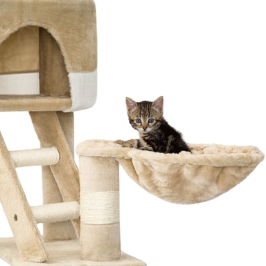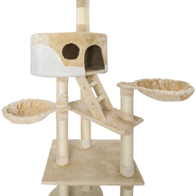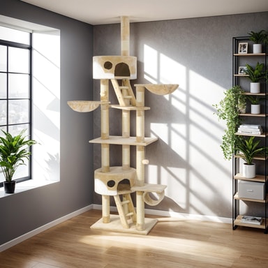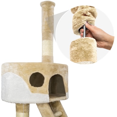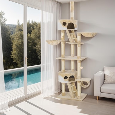 Et klorestativ er et stort høydepunkt for hver katt og er en ideell måte for katter å slipe klørne mens de holder møblene dine intakte. Men klorestativet fungerer også utmerket som et sted å sove eller kose seg. Katter er veldig nysgjerrige dyr og elsker å holde øye med alt - så et klorestativ passer akkurat for din firbeinte venn. Kattetreet består av mange forskjellige funksjoner i varierende høyder som når helt til taket. Støttesøylene er pakket inn i sisal-tau, ideelt for å tilfredsstille enhver kattunge eller katt som skraper. Kattetreet har også hengende tauleker, eventyrtunneler og avslappende hengekøyer, som hjelper katten din til å ha det gøy og kose seg. Dette store klorestativet er avrundet med 2 koselige huler, ett på lavt nivå og ett høyt, som lar kjæledyret ditt ta en viktig kattelur etter en dag med lek på kattetreet.