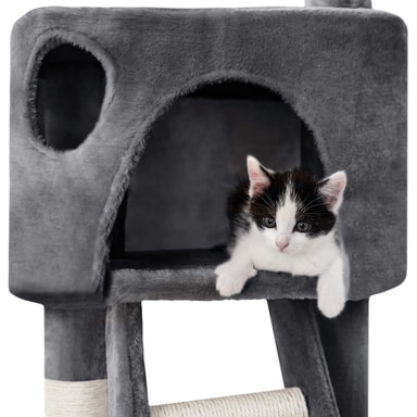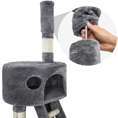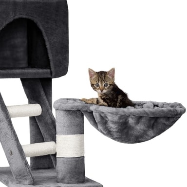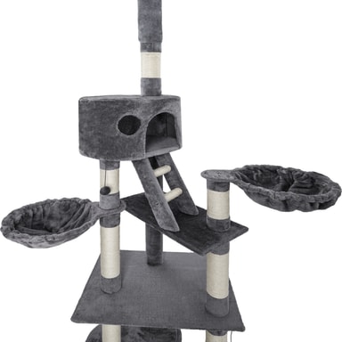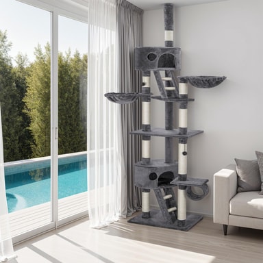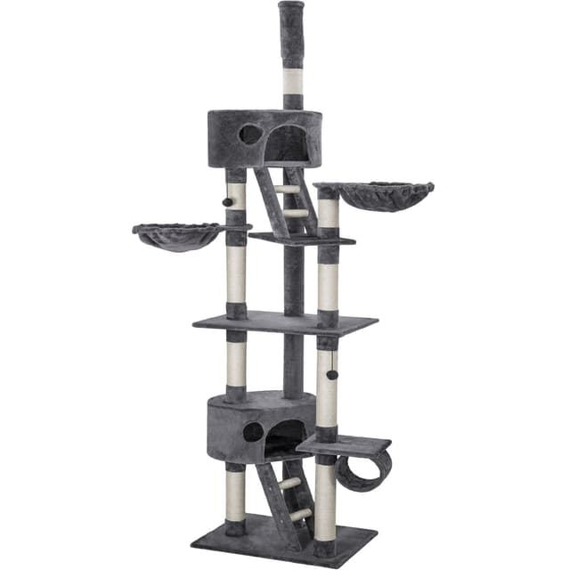 Et klorestativ er et stort høydepunkt for hver katt og er en ideell måte for katter å slipe klørne mens de holder møblene dine intakte. Men klorestativet fungerer også utmerket som et sted å sove eller kose seg. Katter er veldig nysgjerrige dyr og elsker å holde øye med alt - så et klorestativ passer akkurat for din firbeinte venn. Kattetreet består av mange forskjellige funksjoner i varierende høyder som når helt til taket. Støttesøylene er pakket inn i sisal-tau, ideelt for å tilfredsstille enhver kattunge eller katt som skraper. Kattetreet har også hengende tauleker, eventyrtunneler og avslappende hengekøyer, som hjelper katten din til å ha det gøy og kose seg. Dette store klorestativet er avrundet med 2 koselige huler, ett på lavt nivå og ett høyt, som lar kjæledyret ditt ta en viktig kattelur etter en dag med lek på kattetreet.