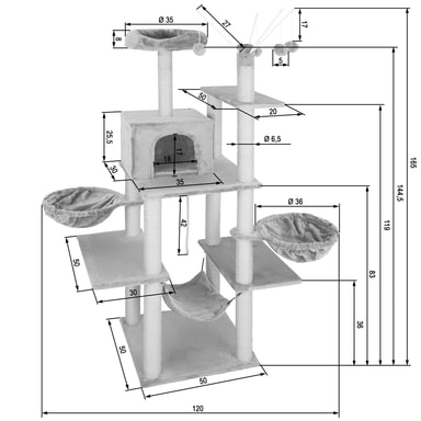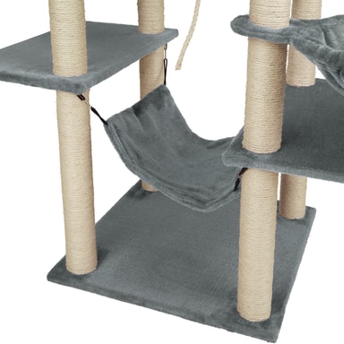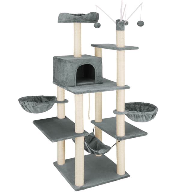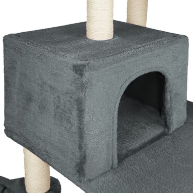 Dette robuste kattetreet med mykt plysjtrekk fra tectake er et paradis for enhver huskatt som elsker å utforske. Tau, hengekøyer, hengende leker, senger og en kattehule gir kjæledyret ditt mange måter å leke, slappe av, sove og kose på over flere tårnnivåer. Det øverste nivået har også en utsiktsplattform. Herfra kan katten din holde et våkent øye med alt og alle. De mange søylene har fin og slitesterk sisal, ideell for å slipe klørne og skrape. Dette gjør at katten eller kattungen din kan fjerne overflødig slir uten hjelp fra teppet eller møblene. Takket være at det store kattetreet har mange forskjellige nivåer, kan flere katter bruke dette treet samtidig med mye aktivitet. Dette multifunksjonelle kattetreet fra tectake garanterer timevis med moro og action for kattene dine.