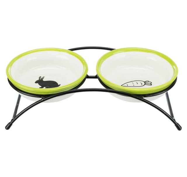 Skålsett for smådyr beskytter maten mot avføring og urin 2 keramiske skåler med stativ pulverlakkert metallstativ, svart sklisikre på grunn av gummiføtter farge: hvit/grønn