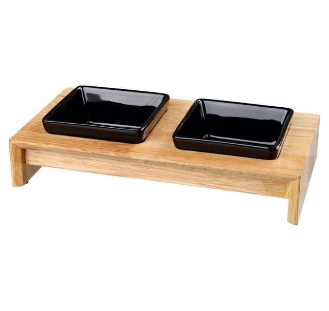 Skålsett, keramikk/tre 2 keramiske skåler med stativ tungt stativ laget av lakkert hardtre (gummitre) lavt støy og sikkert hold på grunn av silikonbobler mellom skål og stativ sklisikre på grunn av gummiføtter Mateskåler tåler oppvaskmaskin